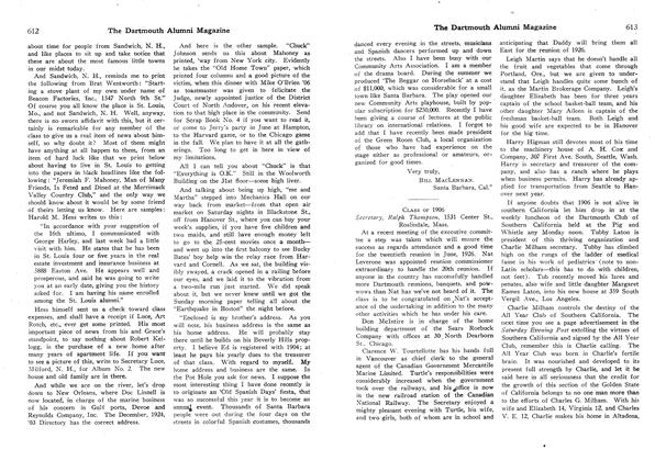 Happy New Year to every '06er! At the class dinner held the night before the Harvard game about 40 of the faithful turned out. The general program for the big 20th reunion—which is only 18 short months away—- was briefly discussed. It seemed to be the sentiment of the men present that a program having but one day devoted to a fixed schedule of events—the rest of the time to be free from a prearranged schedule—would suit the majority of those attending. Further, that the day of scheduled class events should be Sunday. This is usually the day set apart for a class picnic. Any further ideas along this line will be welcomed by the Secretary or any member of the executive committee.