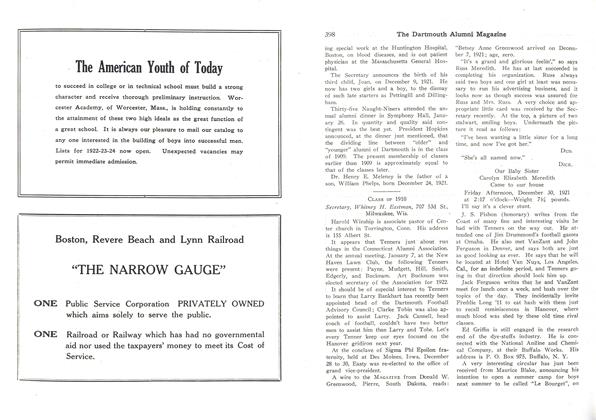 1910 was very well represented at the annual banquet of the New York Alumni Association, which was held on Tuesday, February 3, at the Hotel Plaza. The following were present: Harry Sandberg, Ray Cutler, John Vander Pyl, Ray Seymour, Otto Taylor, Abe Coleman, Walter Golde, Wes Hunt, Fred Batchellor, Hal Jackson, Allen Doggett, Clarke Tobin, Si Richmond, Dixi Crosby, John Cassidy, Phil Forristall, Jim Porter, Lenny McClintock, Les Wiggin, George Chamberlin.
