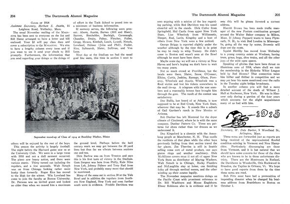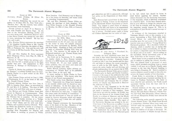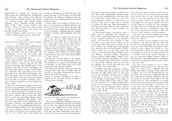 John Kimball burst into print again the morning after the Boston alumni dinner,—it was an inexcusable oversight on the part of this reporter that the news was not printed last month. But the fact remains that John got himself elected a director of the Boston Alumni Association, which position he has so capably and efficiently occupied this past year.