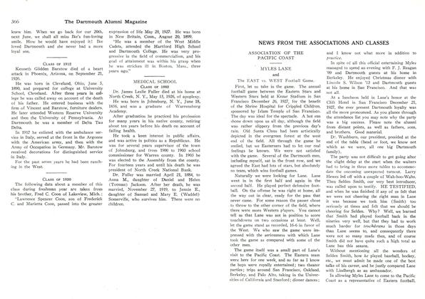 Last year about this time a two day holiday was granted all Dartmouth men, and we went to a barbecue put on by our vice-president, Bill Wright '18, at his ranch, "Rancho Tularcitos", in Monterey County. It was a part of our annual meeting, and everyone said, "The best ever or ever to be", but what a poor prophecy. This year we had the "best meeting ever", with President Hopkins again with us. And let me say right here that President Hopkins brought the college of today nearer to our hearts than ever before, and aroused a greater interest and respect for Dartmouth in the minds of this whole community.