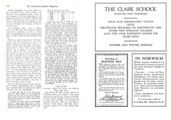 "Upon the globe where our lot does happen to be cast there are some eighteen hundred millions of persons. If I had the pick of the whole flock I would choose for the job of heading the administration of Dartmouth College no other than its present head. I would waste no time in looking for better men than the present board of trustees. I take off my hat to the men who are doing the teaching. They have each and all kept the faith. And it looks to an unbiased observer .of the great conflict between Light and Dark- ness as if this moral continuity were a good thing. The mere fact that a college is old doesn't carry much credit. Anybody can be old if he lives long enough. The trick is to get the cultured discernment of age while keeping the alert adaptability of youth. This College, has the spring of youth and the autumn mellowness of age. It has capitalized its winter and it has the makings of an intellectual capital in summer. It is endowed alike by environment and heredity.