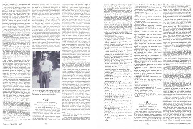 Charlie Rauch sprung a visit on us not long ago and spread himself over both ends of the extra bed in the apartments at 48 South Main St., which I share with Ping Ferry '32. We got ourselves a-straddle some nags and made cracks at one another's horsemanship among the frosty hills over beyond Norwich one autumnal late afternoon. Charlie has superlative equipment for horsemanship, because if his nag gets too ambitious Charlie can resort to bicycle tactics and drag his feet. He then took himself off on the Washingtonian and entered Wood, Struthers, and Company, securities experts, New York. He is hanging his other suit in the Dartmouth Club for the time being.