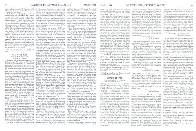 And how every one of us longs to get back to Hanover, even though it's only for a day or a week-end. The mere mention of the word Dartmouth or Hanover immediately sets in motion a panoramic view of familiar scenes and places which we never seem to grow tired of looking at. There's the Campus, Dartmouth Row, and the Commons piazza, where the Barbary Coast (with Ken Semple tickling the ivories and Oby Barker coaxing notes and chords from a banjo), is doing everything possible to take our minds off studies during the warm spring nights. Then we catch a glimpse of the Nugget, the College Book-Store, Allen's drug store, and the Co-op, while across the street Jim Campion is reminding us that "It's more than a toggery," etc. Only with great effort can this flood of happy memories be temporarily interrupted while we turn to the secretary and say: "Miss Swovis, take a letter to J. P. Morgan, please."