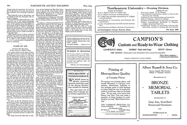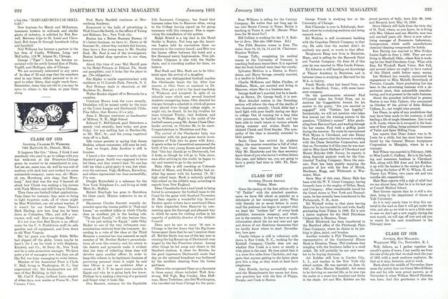 A good letter received from Skipper Drayton on the stationery of Clarence I. Drayton, certified public accountant, Manchester, N. H., explaining his activities in that section. Skip says that Bill Lary is still with the Texas Co., and has been transferred to those parts. Also that Don Solis is with the same company selling oil in Boston. Al Clarke has established a very nice insurance business in and round his home diggings, Berlin, N. H. And Jack McLaughlin is still in Phila., advertising Campbell Soup.
