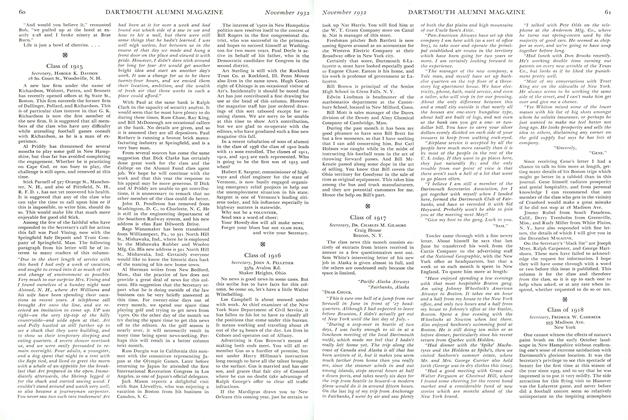 Always being a lucrative gossip-monger, Jones, as usual, hasn't failed us, and again has come across with some random shots as follows: "S. Mongoose Morey, the Sage of Sinclair, is recuperating from talking about his operation on the other side of the water. He has promised the home town boys some pustals from Parus, a fountain pen full of Pilsner from Munich, and a cold in the head from London. We certainly miss America's largest lighter-than-air liner, though the local thoroughfares are much more passable in his absence. Lewie Lee (Velvet Joe) officiated in the formal loading of the great craft aboard the George Washington, assisted by the ground crew from Lakehurst.