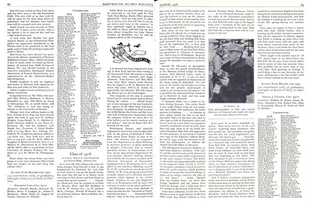 Jake Bingham maintains he saw George "Fat" Rowell, none other, sitting within the bar enclosure the other week—this time, however, it was the bar of justice, and Fat was eloquently pleading a case as only this eminent Boston barrister can. .... The principal of Framingham High (Mass.) is our old classmate Mayo Magoon. It's kind o' late to list those who attended the Boston Association dinner on January 20, so well merely note that Eighteen was well represented with some 15 or 16 on hand. Your Secretary hopes to get to Boston soon (as noted in paragraph two), so maybe there'll be some scandal to report by that time that doesn't seem to be available for this month's column.