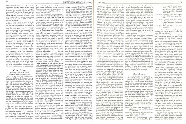 "Then Dean Bill explained the inauguration this June of Hanover Holiday, which, he states emphatically, is primarily an opportunity for alumni and their families to come to enjoy the attractive quiet of June in Hanover—not for the educational privileges! He says, by the way, that there's nothing so sweet as the hush that falls over this town about five minutes after the students leave for home (Did you know he was glad to see us go?) Well, Helen and I are going to find out about this 'summer Hanover'! Yes, and we intend to take in some of our favoriate lecturers as well, who are to expound on their particular topics. The idea of this holiday should have a wide appeal, methinks, especially, as Dean Bill put it, 'for browsing and mulling around Hanover.'