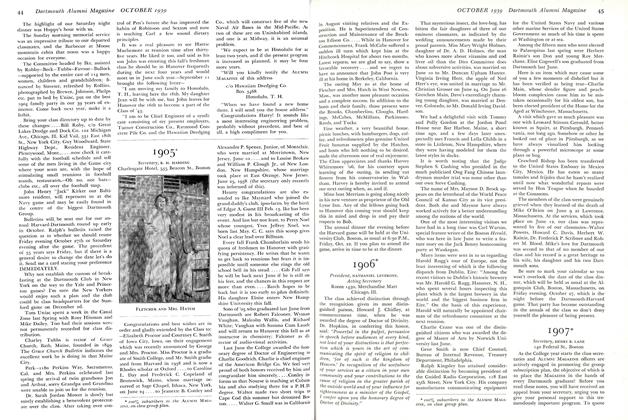 A message from Bob Stokes is always welcome. He writes, "Met Al Farrier one hot day on the subway about a month ago, and he looks fit as a fiddle, almost as good as he did on the Dartmouth line back in 1903-1906.—N0 news about myself (!). But —to whom it may concern, both my daughters are through Mt. Holyoke, one continuing for her Ph.D. at the University of California. And my post-bellum son will be ready for Dartmouth next fall."