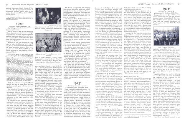 "As one who really know doesn't envy Frank Morey his job of furnishing the magazine with a column of class notes each month for nine consecutive months I take my pencil in mouth and chew, with the thought of giving Frank a little relief. My song is 'As the checks go tearing by,' but this isn't a dun. It is ramble ad lib as it were. You all know that our class has agreed to a group subscription for this magazine, and as far as our class is concerned it means that we underwrite each year some 250 subscriptions—and then hope by January Ist to have collected enough money to square up. Personally, I get a big kick out of the work for several reasons. Enough wisecracks arrive in my mail from such 'eggs' as Johnnie Allen, John Stickney and others to more than compensate for my labors. Even one wife wisecracks at me—Mrs. Art Pfeiffer—but I can take it. She writes a mean check.