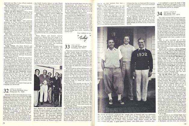 Stan Neill, as I am sure has been reported, covers New Hampshire and Vermont, selling raw wool to the mills for Forte, Dupree, & Sawyer Co., wool merchants. . . .spends every Monday night in Hanover. Now two years on the road, previous two Neill years were spent on the docks and in the warehouses. Still single himself, Stan reports that Charlie Rolfe is progenitor of twins born in January and named Richard and Anne. Rolfe has built a house and even has a vegetable garden Bob Smith placed No. 1 man among 150 who took internship exams in January at the Boston City Hospital first part of the year. The first 15 were accepted, and Bob's preeminence gave him first choice of what he wanted to do under what doctor Neill says he sees few other"'34 men excepting Joe Dolben, from whom he manages to take money during golf season.... also runs into Ed Davis and Bob Webb at hockey games, particularly those in which Spain shines for the Boston Olympics.