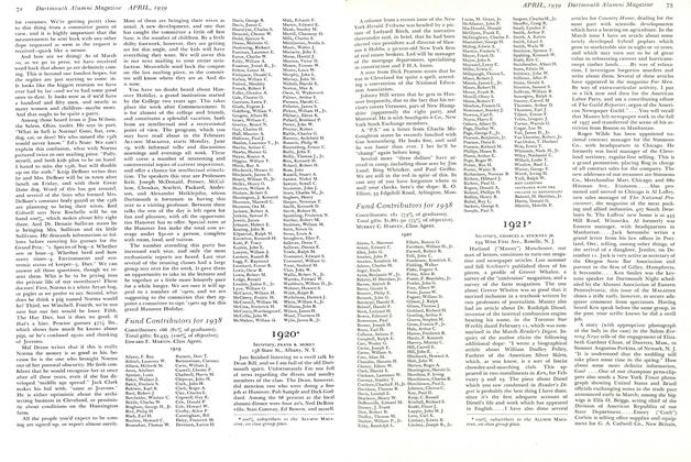 Hats off to the first '20 son in the service. Porte Durkee writes that his boy Bill, Dartmouth '40, is in the British Army. Major Jack Mayer tells us that he is temporarily stationed at Fort Leavenworth, Kansas, at the Command and General Staff School. Jack's only complaint is that he missed all this fall's football games. He reports seeing Charlie Sargent at Fort Monroe, Va. This is true as the same was reported by Charlie's wife. She said that from September through November Major Sargent was in Camden, S. C., taking part in the First Army manoeuvers. He is second in command in the Public Relations division and his forte seems to be entertaining the various visiting dignitaries, both military and civilian. However, his greatest delight is that he is stationed at a hotel and for the first time in 13 months has an honest-togoodness bedroom.
