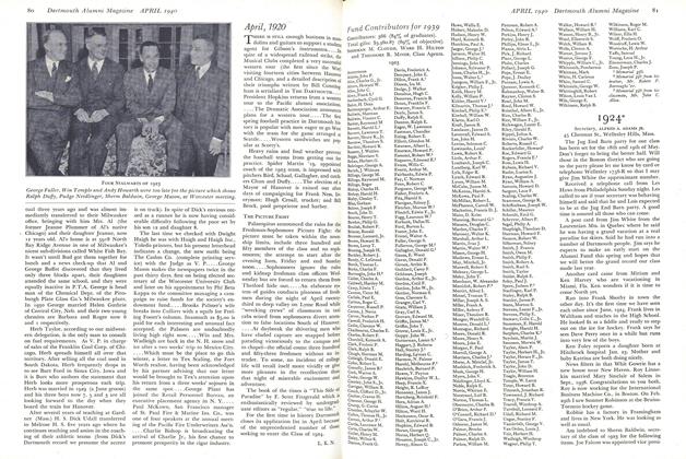 Nice letter from Dick Henry reporting the December second meeting at the Dartmouth Club in New York. Bob Strong was the guest of honor. "Need I say, in passing, that there were the usual preliminaries, rounds and rounds, before, during, and after dinner. Questions about Hanover and the college and all its doings were fired at Bob at considerable length. Likely Bob had wished that he might have been on Information Please—he would have saved the sponsor money. Thanks Bob, and come again. Everyone enjoyed the evening thoroughly. There was a most encouraging turnout. There was Red Holbrook, who, during the course of the evening asked Bob why his skiing wasn't better—apparently because Bob had joined Red in a snowdrift in the environs of Hanover last winter. And the bankers, Don Coyle (New York Trust), Ted Haile and Johnnie Woodbridge (Irving Trust), Stub Reid (Western Electric), Rollie Barker, the schoolmaster, Frankie Granata, importing and exporting, Bill Short, Patch Tompkins, Smoke Smith, Gillie Thornton and Paul Synnott all put in their appearance, together with Charlie Amelung, Curt Bird, Bob Fistere, Bert Manley, Doug Graham, Hal Springborn and Dave Dyche. Al Hadlock also stopped in for a while. The evening was rounded out with several reels of films—including College movies, Brad Hershey's movies of the Jug End party last spring, some taken by Jim White at his summer place, and a reel loaned by the Swiss Railroads showing the experts cavorting in the Alps. And so, Jeff, the New York contingent have just finished off a most enjoyable evening." Thanks for your nice newsy letter, Dick.