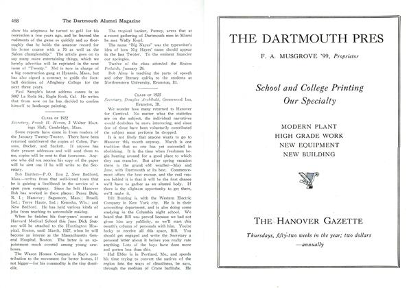 Sgt. Doctor Maloon (nicknamed "John") is interviewing and classifying the recruits arriving at Camp Upton. "My leisure time is spent at the Dartmouth Club and up at the USO picking up free tickets for Broadway shows. (I wish Dr. Areson could read this.)" P.S. Areson's mother calls him "Squash." John Hoffstetter is in the Naval Ordnance Dept., stationed at Erie, Pa. Carl Gram believes he's in Los Angeles to stay. Most of Carl's dough goes to Brad Peterson, Bob Morris, Bud Walls, and Bill McMurtrie via Calif, poker (the Californian never loses). Gail Compton, with a little girl one year old, is the Farm Editor of the Chicago Tribune (Gail is, not the little girl) and is now writing a series of articles entitled "How to Make a War Garden." One of his paragraphs reads: "A war garden is not a difficult undertaking, but the responsibility should not be accepted lightly. Rightly done it becomes an impressive contribution to the nation within reach of everyone."