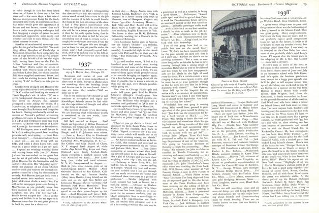 RUG'S STILL HUNTING SLUGS. He wrote to Bill Rotch. Bill wrote back: "Getting 3 bucks out of some of us New Hampshire Yankees must be a little like pulling teeth; not that the teeth come out so very hard, but it takes so much prodding for us to get around to having the job done. Buying nipples, bottle caps, diapers, lactose, Mellin's food, pasteurized milk, safety pins, whooping cough inoculations, concentrated cod liver oil, strained prunes, spinach, carrots, and now and then a shiny rattle for young Pete leaves just about $3 in the bank, which might as well go toward the Class of '37 as toward a potential Dartmouth '63 man." Tom O'Brien spent 3 yrs. at Harvard Grad. Sch. of Ed., 1 yr. teaching at Drake High Sch., 1 yr. at Ky. Military Inst., and is now back at Drake as Registrar. His wife also teaches school. Bob Hahn is in marine insurance, S. Orange, N. J. Parker Johnston (called by his mother "Jav" ever since he broke the record on the southern trip) is now with the ins. firm of Fred S. James, Chicago. Bob Greene's hoping to buy tires for his car which he uses to sell hearing aids. The aids themselves have a B-i rating, the highest non-military classification. Tony Genewich is with Callaway Mills in N. Y. but may be transferred to Ga. and then La. His roommate at 302 E. 29th St. is Art Guyer, N.Y.U. Med. Student who earned part of his tuition teaching in the Hanover Inn Ski Sch. during Xmas. Bill Hoyt is an accountant with Pan American Airways, Africa Ltd., at Accra, Gold Coast. He's signed up till Dec. '42.