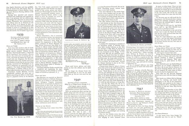 From "Skip" Morris' wife comes a letter stating his enlistment in the Naval Reserve on January 9, and he is now located in South Bend, Indiana, taking the midshipman's course at Notre Dame. Approximately forty Dartmouth men are in his class alone and from alt reports, the Dartmouth boys are still frequenting the beer halls. The Morrises received a pre-Christmas present, for on December 4 they became proud parents of a baby girl. Other news contained in Penney's letter includes information to the effect that Lieutenant Bob Brown is in Louisiana with wife, Nancy, and young son, Bob Jr. Mike Daley is somewhere in the South Pacific. Frank Farnell who is also a lieutenant is with his wife, Bobbie, in Waynesville, Missouri. Penney also writes that at Christmastime they saw Peg Britton, who plans shortly to join Hank in California. He is now an ensign and also the father of a son named after him. I sure wish more '39ers' wives would write, giving me information as to their respective husbands and '39 friends.