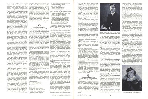 News from the fighting fronts of the world includes the following promotions: Sonny Foley, who is Somewhere in Africa cleaning up on the Axis, has recently become a captain. Elevated to first lieutenancies, very deservedly, were Steve Butterfield and Tom Wollaeger. Capt. N. H. Wentworth was still awaiting a call to foreign service as of early May. In sending in a generous check for her husband's Alumni Fund contribution, Eleanor Marcus says her husband will reimburse her for same, but can't do so yet because he has no account with the North Pole National Bank. Lt. Marcus' letter on a snowshoe hunt for rabbits was contained in the last number of this MAGAZINE. My local undergraduate informant, who has the distinction of being a fellow-townsman of Red Drake, presents a clipping from the Auburn (N. Y.) Bugle: "Harold Drake has finished his basic training and is now a candidate assigned to 23rd Battery, 0.C.D.. A.A.S., Camp Davis, North Carolina." Bill Harlow is with the U. S. Army, and can be reached through 28 Albion Street, Hyde Park, Mass.
