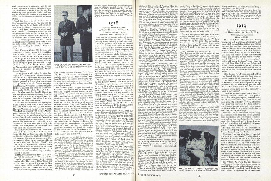 From a letter dated "January 5 of 8.8. Go's Ilsth Year" comes a letter from Vice President T. Reed Montgomery: "Have just finished a banner year. The Government has been very good to the brewers; as we are so necessary in keeping up proper civilian and military morale (We'll say Monty). Our son Tom '46 is in the V-12 at Hanover—when he leaves he'll be a senior and will have been at Hanover less than 20 monthsimagme it!" .... Thanks also to Reed for the clipPing from the Providence (R. 1.) Evening Bulletin - "paul E. Moyer, of the editorial staff'of the Evening Bulletin will speak at the Men's Club on the subject 'Year of Decision.' " Also enclosed is an interesting column headed "In Perspective" and an interesting. column on "Winter," signed with the initials P.E.M., and which we concluded is written by our own Paul Moyer A note from Harvey Hood reports that Cliff Meredith is coming along nicely—that Cliff's wife Ted spent a very pleasant Christmas with the Fred Carleton's, who report a splendid family of five children Harvey also enclosed a clipping showing the engagement of a very attractive girl by the name of Betty Cunningham, none other than the daughter of our own Johnny, and Harvey says, "Looks to me it would be a good idea to have Betty at our next class reunion." .... (She might change her mind, Johnny,—if she saw Syl Morey's son.) ....