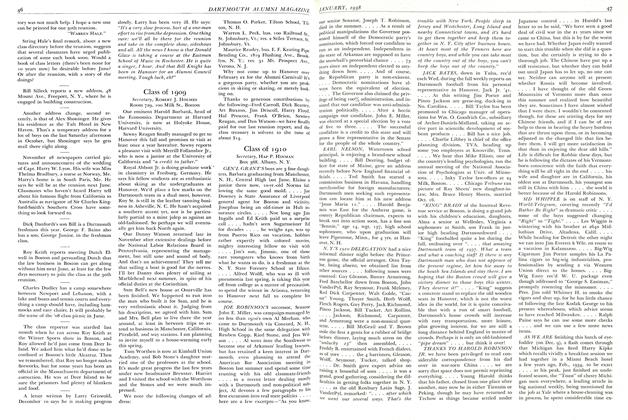 Ross Woodbridge is doing a bang-up job as Red Cross Assistant Field Director somewhere in New Guinea Pinky Conklin is stationed at Aberdeen Proving Grounds, Md. Having graduated from Cadre school, he is awaiting a class to teach. (Probably by this time, he's in the professorial groove!) .. . . Fess Mack, with the Seabees, is in Guam Lt. (jg) Dick Jewell of the Coast Guard, "has at last realized his ambition to go to sea," according to a note from his wife, "and is now on an LST." .... You j:an write to Pvt. FredShurts by getting his addres's from me or the Records office, Hanover Bob Tyler got his two silver bars while stationed at Selman Field, Monroe, La., where he is an assistant post adjutant. .... A local newspaper informs us that Lt. EdChamberlain recently was home on leave. Due to his long silence, here's an up-to-dater on Ed: He enlisted two and a half years ago and was in Panama. More recently, he was transferred to Pacific duty and, as skipper of a sub-chaser, took part in the Saipan and Tinian campaigns RayBuilter is still instructing in communications at Fort Sill (Okla.), Field Artillery School. Most of his time has been spent as an umpire on field problems preparatory for troop duty. He will have left Sill on December 1, for ??? Ted Olson is out on duty on a LST Colin Soule returned to his pre-Dartmouth alma mater, Governor Dummer Academy, Mass., to assist in administration.
