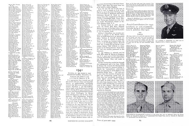 News from Dick McCornack, Lt. (jg) (SC) USNR, informs me that Hank Gunst has left their 1941 Dartmouth Club of Panama for training duty in Florida and Dick would like to hear from any new additions to that area. He says Whitey Fuller is down there now. If anyone gets to the "Cross-roads of the World" he can get Dick by dialling 36-625 on the telephone. It's rather a round about way of learning about Winnie and Bill Freeman's baby daughter, Carol Jean who was born January 22, but thanks for the info, Dick. I'm sure the class sends their congratulations to the Freeman household. Bill is a Jg. helping to build small craft at Benton Harbor, Michigan. Gee, there are more babies to report this month. Here's another.