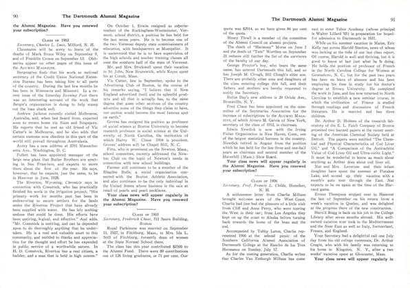 Watty, with so much overtime in his defense work, has little leisure nowadays except for an occasional evening to enjoy the opera or a good movie, but he and Mrs. "Watson are expectantly looking forward to a renewal of the pleasure they enjoyed last year at Swampscott where they plan to join the others at the class rendezvous there this month.