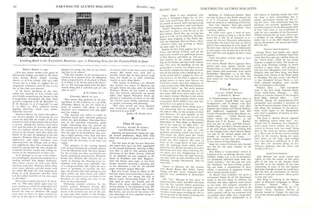 As the months pass, we shall try to perfect a system whereby news of the class comes regularly and from all directions to this waiting typewriter. But the first and most important step in that direction is already a fait accompli. Ray McPartlin has said yes to the secretary's plea for unfailing contributions to this column; and anyone who remembers Mac well will be quick to spot the products of his journalistic eagle eye and his feature-writing pointed pen. By way of getting his hand in, Ke reports that Hal Bernkopf has been reelected president of the Hecht House board of trustees, the same being "a kind of settlement house-plus." Mac likewise contributes the following anonymous tribute from a Boston attorney friend of Cy Rounseville's, who laments Cy's departure as Commissioner of the Massachusetts Industrial Accident Board: