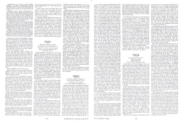 "Now let me give the rest of this letter over to telling you about the men in our class whom I have seen since we arrived here at the end of Aug. To give a semblance of order to an otherwise disorganized journal, I will try to do it chronologically. In that stretch of hot weather just before Labor Day week-end, I saw Frank Blatz who was on his way back from camp with 'Pete' his sturdy 13 year old boy. Frank and his wife didn't let the heat keep them off the golf course a single day they were here. They stayed at the Sweets' on Lyme Road and we enjoyed a 'cooler' with them the afternoon when the temperature nearly broke 100. The same week on the Inn Terrace, having lunch, I spotted the Jim Godfreys, also homeward bound from camp. A few days later Joe and Franny Aierriarn dropped into Hanover for a few days of much needed rest, which Joe proceeded to find on the tennis courts with Al Frey. As you probably know, Joe is now with Cresay, McCormick & Paget, Management Engineers in New York, and he is having the fullest possible opportunity to apply all his Macy and other retail store experience in the assignments loaded on him to date. He was buoyed up, too, by the prospect of moving into a house in Pelham this fall, after nearly a year of hotel life.