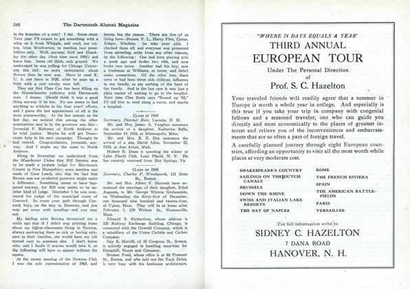 This month I am going to make a personal report o£ a visit to Hanover, where Elizabeth and I went to attend a fraternity banquet in December. When the train reached Holyoke, we were sure there would be snow at Hanover. There ought to be snow. When we arrived the campus was beautiful, with a large green Christmas tree in the center. Friday evening there seemed to be a hush all over the place. The bells were ringing clear and cold like sleigh bells ring on the clear, quiet night of first snow.