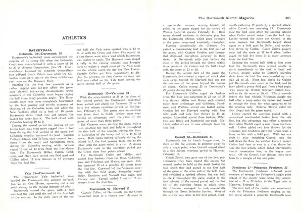 Leading scorer for the Green was Paul Campbell. Ed Leede stayed up with him most of the season, but failed to approach his record-breaking total of the year before. The last few games saw Leede slip somewhat from his high scoring of the early season, which left Campbell to carry the ball almost single-handed. Campbell and Chip Coleman will be lost by graduation this year, the latter after playing four years of Dartmouth basketball (before and after the war) and captaining the team twice. Captain-elect Leede, Field, and Sullivan from the starting five will be back for an other year, with Sullivan expecting to graduate in February, 1949. Hudak is a broth of a boy and only a sophomore, and most of the squad are in their first year of varsity competition. So if experience means anything, next year should be a good one.