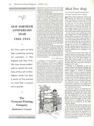 This is a privilege and a blessing, but it carries with it the obligations of eminence. Harvard's new Lamont Library, successfully opened a few weeks ago as a New Year's gift to the undergraduates of the Yard, is a reminder of another sort. Baker has come of age—21 years. We're still much bigger than Lamont is ever intended to become, and thereby dangles a distinction. Bigness can be a disadvantage, as the dinosaur, despite his extra brain aft, appears to have discovered in due course. Consequently the complexion of the Dartmouth College Library's activities has been altering, over the last few years, in ways that are calculated to adapt it more efficiently to the needs of modern learning and teaching.