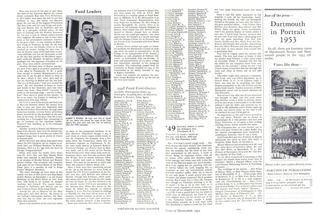 Bill Ballard, in television production in New York, recently put on a big show which Tom saw and enjoyed. Charlie Eaton is a life insurance tycoon in New York and recently nailed down Doug Parsons as a customer. BobPridham works with Tom in Tom's father's Thomas Textile Co. in New York. Bob's wife Joyce donated to the growing Dartmouth enrollment list a baby boy Robert, born about a month ago. Jay Urstadt is in Cornell Law School, his ninth year as a college student (a record for our class?). Dick Wolff works for J. P. Stevens Textile in New York. Claude Offray works for the Maryland Ribbon Co. Claude's wife Gloria Ann recently increased the family with a baby girl. Paul Erwin goes to Temple Law School nights. He was up at Winter Carnival with what Tom describes as a knockout. Bud Hughes is in the Coast Guard. Tom himself is to be married June 21 to Miss Ann Phillips in South Orange, N. J. His choice is a very charming gal, incidentally. Tom's dad's textile outfit makes and sells infant wear.