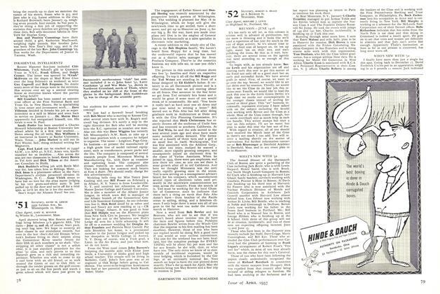 The following made the newsprint recently for various and sundry reasons listed, as a matter of fact, under a wide variety of topics - the society page excluded for the moment. The Springfield Republican uses the title "Coach" before the name of Paul Sanderson on their sport pages as they cover Suffield Academy's hoopsters. Dave L. Larson recently received the American Spirit of Honor Medal. He's wearing Air Force blues at the present. Jumping Joe Lyons won the class B event on pair of three slotters off the jump at Bear Mountain last January with Herb Drury placing sixth in a field of 26. The Order of Chevalier was recently conferred upon Bob Millhouse. Bob is at the Med School in Hanover. Jim Ketchum, who was with the class but transferred during his Junior year, received his B.A. at Columbia and is now at the Cornell Med School. He recently won a statewide scholarship for professional study in medicine and from all reports is burning up the field down in the big city. Drew Sleeper won his wings last December and is now a jet jockey with the dry land flyboys. Dick Swicker of DBS fame is interrupting a career with NBC to serve a hitch with the 34th Field Artillery Battalion at Fort Dix, while Bob Williams has had Second Lt. before his name since September last - in the Marines, that is.