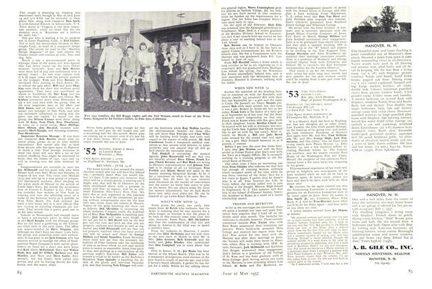 Back in the States at this writing and finally the mails have caught up with me, so we're off to the races with what's with '52s hither and yon. With the Ides of March fast approaching us, my thoughts wend their way back to a school called Tuck where, despite the laudings of free enterprise and the weak protestations as regards taxes, the securityminded are beginning to feel a draft on their green-backed necks. A reflection of same came to my attention in the form of a questionnaire on which I was to give advice as to what the best deal is in this outfit. I was not the sole recipient of the poll. In fact I understand Gallup has nothing on this association which calls itself "The Future Boy Ensigns." All I can say is their fate, despite interrogation directed at those of us already in the service, is in the hands of greater powers. Nevertheless, good luck, Hucksters.