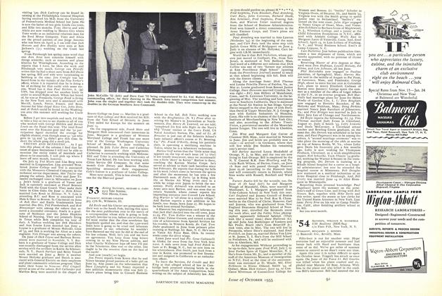 If you want to see someone who is really "tanked-up," you'd ought to see Mike Spicer. He's at Fort Knox in the Armored Corps. Mike, thar's gold in them thar hills. Marine and Louie Bill Petty is another tankman. Bill and wife Carrie lasted until just before Christmas at Quantico. However, Bill's orders came in and he's elsewhere now. And for those of you who inhabited Wigwam Circle last year it may interest you to know, so Bill relates anyway, that that stolid and hallowed women's organization - the West Wigwam Bridge-Flick-and-Gossip Society —did not perish on that fateful twelfth of June 1954. That know-all, see-all, and reveal-all sisterhood, that great promoter and protector of the women's proverbial prerogative, lives on on the tongues of its members.