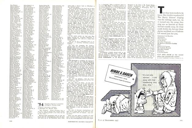 In the "really gone" brigade is Chuck Dickerson, who married Marcia Rice of Green Mt. and Lexington, Mass., on December 4. The Dickersons had their reception at the celebrated Wayside Inn and plan to set up shop in Pittsburgh. Believe that Chuck is attending Rochester Med School. 2nd Lt. Mike Korjeff knotted nuptial ties with Ann Rayner on December 27 in Newton, Mass. Anne hails from Skidmore. Betty Ann Feldman and SheldonWoolf sealed their bonds in Providence, R. I., on November 21. Betty Ann's a senior at Wheaton. And way back on August 27 Maryclaire Craggs roped Charlie Salzenstein, in Peoria, Ill. Jim Wygant was seatin' the customers. Both Charlie, who is an air controlman in the Navy at Atlantic City, and Maryclaire were graduates of Bradley.