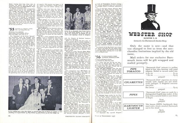 Dave Rice and Lois Warner were among the many August couples that hit the '56 trail. The bride was graduated from Northeastern University where she majored in sociology. Before entering the University of Pennsylvania Law School, John Higgs married Helen Piatt. John and the Mrs. are now living at 4050 Chestnut Street, Philadelphia, Pa.