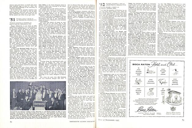 There are more, more. Ron Scott is engaged to Miss Sara-Barbara Zeman of Wynnewood, Penna. Sara is a Lake Erie College graduate. Ron's studying at the University of Pennsylvania School of Law. Another '52 still at his advanced studies, Stearns Morse, is now engaged to Miss Dorothy Forbes, a Vassar junior. Stearns is at McGill working on his Ph.D. in geology.