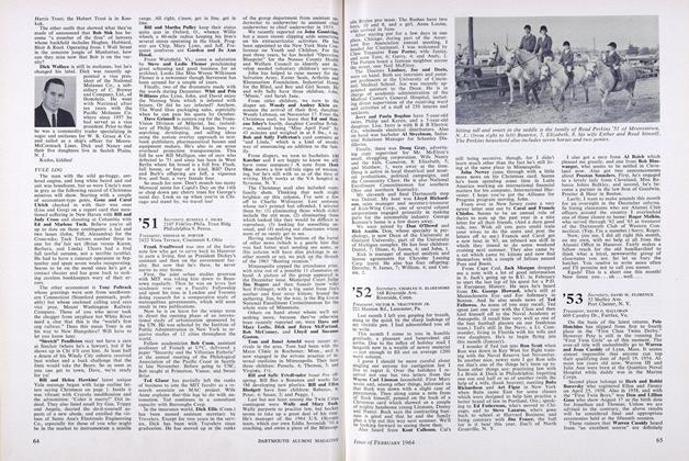The talented Fielding family (L to r) Sue, Jed 7, Andy 4, and Doc '43 pose in their NewtonCenter, Mass., home. Well known in New England television, Sue has just completed a jazzalbum under her stage name, Sue Bennett. Doc has an extensive practice as obstetrician andgynecologist from a Dartmouth Street address in downtown Boston.