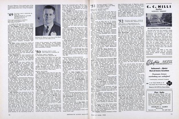 Since I realize I cannot cover all the news I have on hand in the space available to me this month, I'm going to start out and cover all the new members of the 1952 class family through marriage (or engagement announcement) and birth, then move on into the general news. Rather than hold the remaining items for next year, I hereby promise you a Secretary's Dividend in July; with newsletter editor Dick Watts' permission I shall turn out a Secretary's Special covering all '59-'60 news I have unreported and also giving you a Buck's eye report on Hanover today and the academic year now coming to an end.