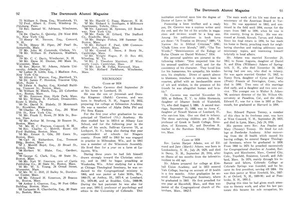 Larry Leavitt serves the class not only as its Head Agent but also tries to keep your correspondent informed on doings in and about Hanover. His last note indicated: "Bea and Jack Norris were in New London this August. They went sailing with us one afternoon. They are building a retirement home in New London for a future date. Dot and I dropped in to see Phoebe Coykendall for a few minutes one evening. She seems in good health now. Florence Perkins tells me she has become a grandma. Her son, Don '53, has a son - 'another Dartmouth prospect.' 'My work,' she said, 'continues to be very interesting in many ways. So much is being done at our school to provide teachers for deaf children.' Dot and I attended the wedding of the Braces' daughter at Northport, Maine. Pete Blodgett and Alice were there."