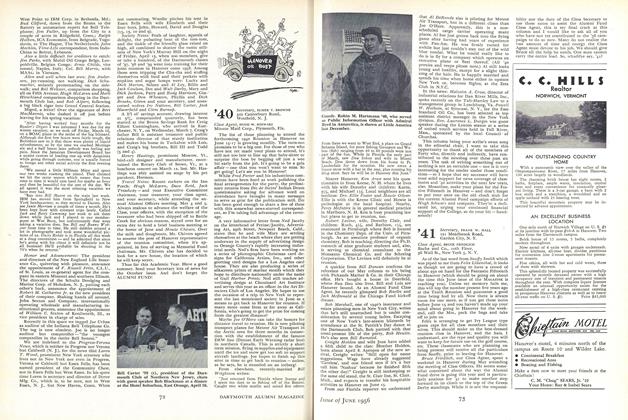 Well, that's all from Nagoya. Now for our special "24 years ago this month" and I'll see you again in June. Cliff Stratton won $100 in the Barge Oratorial Contest for seniors; Brodie Bjorklund pitched a two-hit shutout as the Tri-Kaps beat Pi Lam in baseball — 4-0; Jim Andrews had the lead in "The Male Animal"; Bill Clark and HarryMaxwell were our representatives on the golf team; Pete Keir won the Barrett cup - Mouse Hall had the privilege of presenting the Dartmouth Cup for "the athlete who on and off the field reflects the most credit on the college" to Gus Broberg.