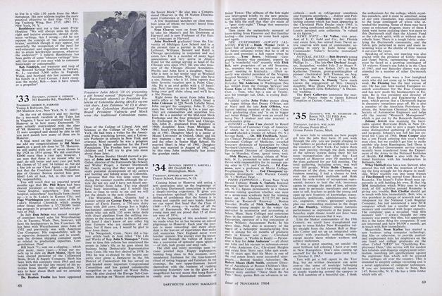 In the sell-out audience we spotted JimBayles, Tom Beers, George Collins and - all the way from Buffalo, N. Y. - AceMiller. The Millers' timing was perfect - Ace and Helen just happened to be in town visiting their son Doug '65 en route to a golfing vacation in Williamsburg, Va., and Myrtle Beach, S. C. Ace, looking ship-shape, is district manager of Revere Copper and Brass - his sole employer since graduation (except for the U. S. Navy in three wartime years). ... He's the grandpaw of a beautiful little girl.