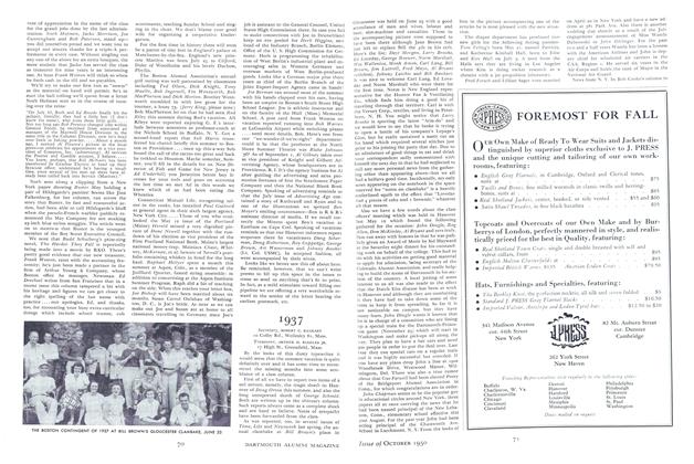 A four page hand-written letter from Tudor Wall says he seldom sees any '37s although he attends the San Francisco Dartmouth luncheon a couple of times a year. Tud sold his steel fabricating business in 1965. He has now established a new firm named Fiberglass Structures that produces fiberglass reinforced plastic fabrications, primarily tanks for storage and handling of corrosives. Two plants, one in Richmond 'north of Berkeley) and the other in Houston, Texas, are run by his bachelor son, Stephen. Tud says the plants are busy and their list of clients looks like the Who's Who of American industry. He sold his sloop (wood, not fiberglass) and they are building a weekend home on the waterfront at Rio del Mar, 80 miles south of San Francisco. Distance being a factor he has only been back to Hanover once since graduation. Hey, Tud, how about this June?
