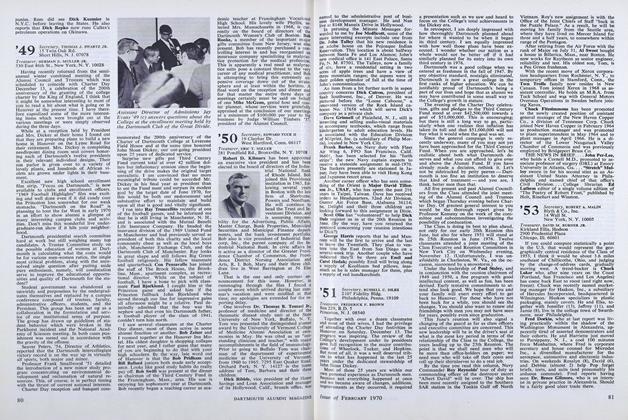Tidbits here and there: the new vice president and treasurer of Knox College is Jim Stevens, who left behind the job of comptroller at Dartmouth. We have lost one of our Hanover representatives and the College its first dean of women, Katharine. Dr. Paul J. Lena, a member of the medical staff of the Concord Hospital since 1959, has been named an associate in medicine (DMS). After hours of exposure and assimilation my reluctant conclusion is that my daughter Renee is right in saying that the best of today's popular music surpasses the best of the '40's. FredFederlein is president of the Cramer Care Division of Fluidic Industries, a pipe, valve, fitting, and mill supply distributor. And Barbara, secretary for the "oldest college newspaper" under Gilroy, Fink, Church and Burnham, now has her MA in English. The current suspense list: PhilChamberlin, Bob (Tim) O'Neil, WesField, and Dave Steinberg. One of the jurors that selected outstanding books from the general trade category for special display at the New England Book Show in Boston was Rod Stinehour of Stinehour Press.