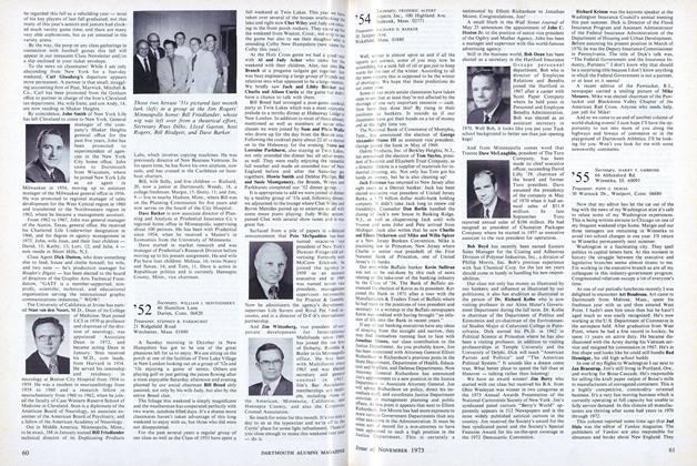 Arrivals on Sunday and Monday were greeted by a magnificent 30th Reunion banner which was suspended just outside the Tuck Mall headquarters for '42. The banner was designed and created by Billand Jane Parmer. Some came from distant lands. Most notable for distance of travel were Bate Ewart from New Guinea, JoeLopez-Silvero from Argentina, and JimFroude from the Philippines. The strong Dartmouth College contingent consisting of Harry Bond, Dick Cardozo, AllanDingwall, Jim Farley, Alex Fanelli, and Ad Winship were 100 percent present at some or all events. The largest family honors probably went to the HughHalsey, Huntley Allison, and Bax Lanius families each with three or four children at the Reunion. Particular mention should be made of two undergraduate sons of classmates, Bruce Williamson and Steve Allison, who were '42 Reunion workers during the entire affair.