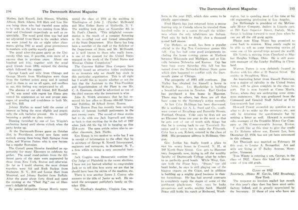 From Al Cate comes a communique in which he disclaims the quotation which I attributed to him in a recent issue of this Magazine. He attributes it to the father of his former roommate from Brookline, Russ Goodnow '21. Incidentally, I learned from Al that he is an "old car buff," being the proud possessor of a 1951 Kaiser-Fraser blue four-door which has wracked up over 200,000 miles, albeit not with the original engine. In years 1951 is old but not antique, Al, but give it time.