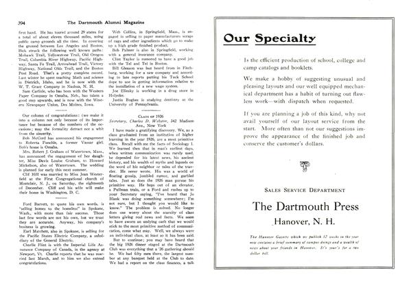 In the last edition of these notes a number of '48 residents of the state of Pennsylvania were mentioned. To this number has just been added Dick Greene. Dick, like the writer, is a New Englander. Unlike yours truly, however, Dick stayed in New England after leaving Hanover, living and working in Boston most of the time where he became a financial analyst of note, developing a number of original techniques for measuring and predicting corporate financial viability. Dick and family have now moved to Pittsburgh where he has accepted a position with Allegheny Ludlum. Glad to have you with us, Dick, here in the country of Braddock, Fort Duquesne, and Bushy Run.
