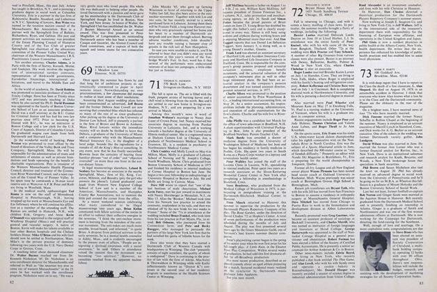 Finally, I share with you the thanks to the Class of '68 sent to me by Adie Henderson,Greg's widow, for contributions made to the Alumni Fund as a memorial to Greg. Adie says that her continued inclusion in the Dartmouth family is very comforting to her since "Greg's years in New Hampshire were his happiest." You are an integral part of the family, Adie, and we hope you will join all of us at the tenth reunion.