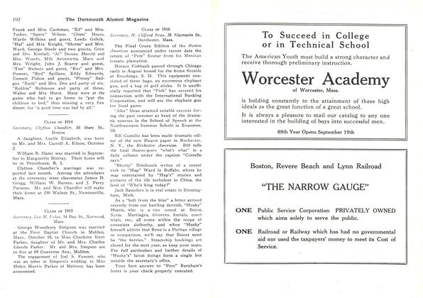 To this writer's knowledge it was not determined who had traveled the greatest distance, but no fewer than 19 made the scene all the way from California, including the Beldings, Coulsons, Fulds, Hotalings, Kochs, Kuhns, Cec Moores, Stevensons, Chap Wentworths, and Ostrander. A few had imminent dates with their surgeons, postponed to insure being present for the festivities. Such was a prospect for Beezie Smallwood, who underwent open heart surgery following reunion, and for Cliff Falkenau, who had a hip replaced, and Bill Rearden, who had a hernia repaired. We hope to report a speedy and complete recovery for Beezie and Cliff. Unfortunately, Bill was stricken with a thrombosis during surgery and did not recover.