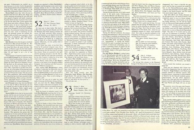 Bob Clark dropped me a note from West Hartford to tell me that his son, Robert Blake Clark, was also accepted early decision for the class of 'B5. Dave Sibley's son, Bruce '84, reported back to his Dad that there was no snow for his first Winter Carnival. Speaking of weather, Paul Dalton is still with Monsanto in St. Louis and admits that milder Midwest winters are appealing to him. Dick Danforth is now head of regional planning for Reno, Nev., and has the door open for any '54s in the area.