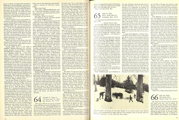 Greetings of the new year to you all. Susan and I want to wish you all a very happy 1982. (I still can't figure out what happened to 1981. Are the years going by faster?) For those of you who took the time to send in your dues, your class officers want to give a special thanks. To those of you who are about to, please take the two seconds and get them in the mail now, so you can say to yourself, "Well, I got it over with."